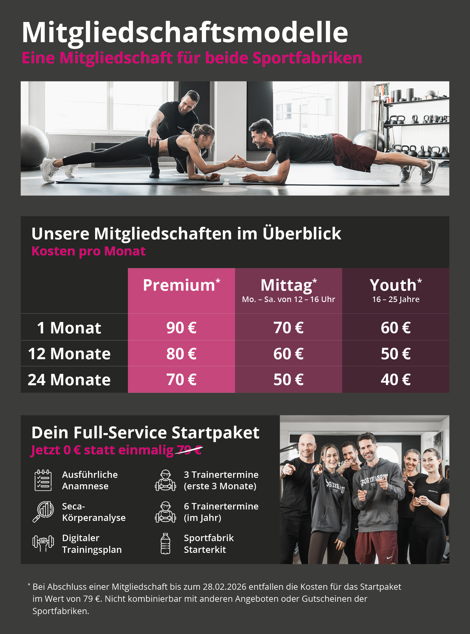 * Bei Abschluss einer Mitgliedschaft bis zum 28.02.2026 entfallen die Kosten für das Startpaket im Wert von 79 €. Nicht kombinierbar mit anderen Angeboten oder Gutscheinen der Sportfabriken.